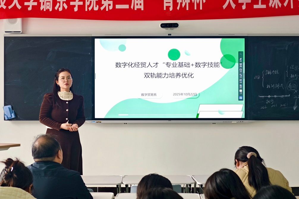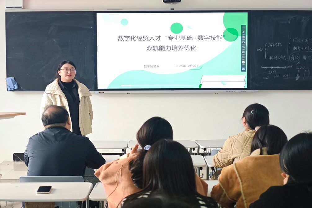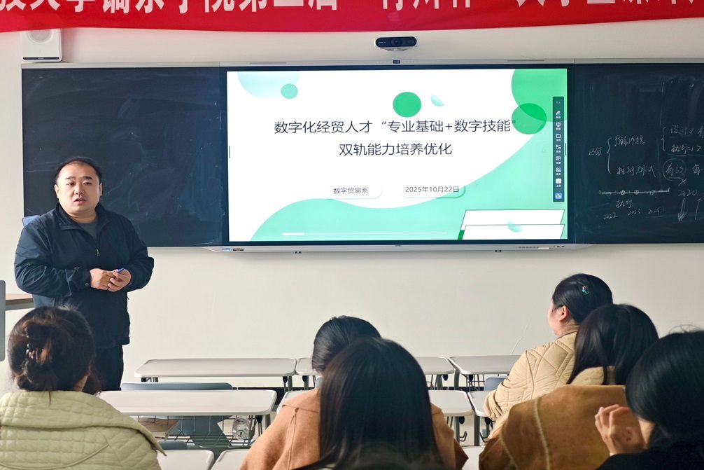 2025年10月22日,数字贸易系于教学楼316教室,以数字化经贸人才“专业基础+数字技能”双轨能力培养为核心主题,组织开展专项研讨活动。会前,数字贸易系主任杨哲老师特别动员参会人员,鼓励各专业团队积极申报校级教改项目,同时围绕微专业方向设置展开深入思考,为后续人才培养改革明确方向、凝聚共识、凝练专业特色。
