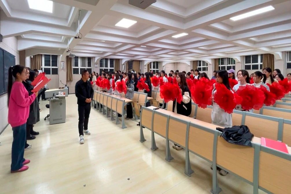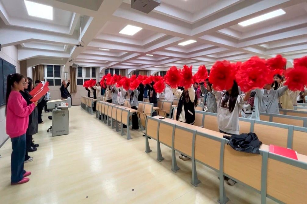 为确保仪式每一个环节的精准与完美,连日来,经贸学子们在大教室内反复推敲、精心打磨,各项筹备工作均在紧张而有序的节奏中稳步推进。参加诗朗诵的学生放弃课后休息时间,逐字打磨语气语调,从情感的酝酿到台风的站姿,反复地练习,只为让每一句台词都饱含深情;手势舞方阵的同学则力抠细节,手臂的角度、动作的节奏,哪怕是一个眼神的默契,都要经过数十次排练,汗水浸湿衣衫也毫无怨言,口中默念的“捍卫中华”,成为青春最响亮的誓言。 排练现场,学院老师始终坚守一线,时而示范朗诵的语气神态,时而俯身纠正手势舞的动作细节,用耐心与专业帮大家攻克排练中的难点,只为呈现最好的效果。