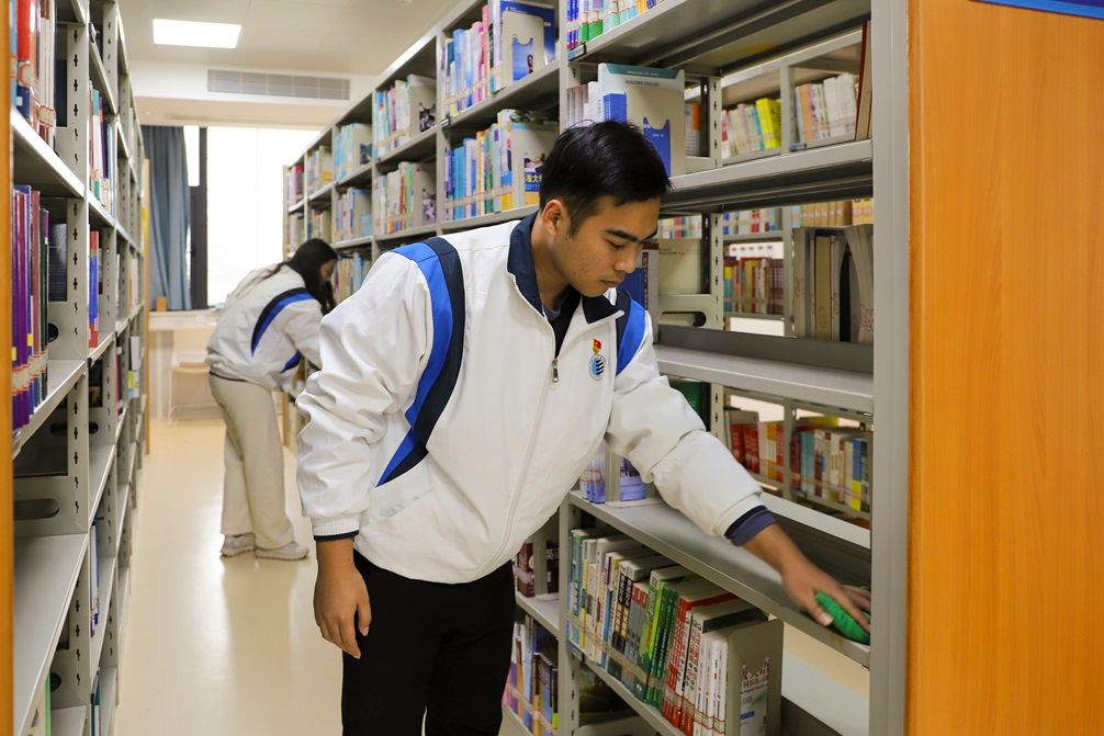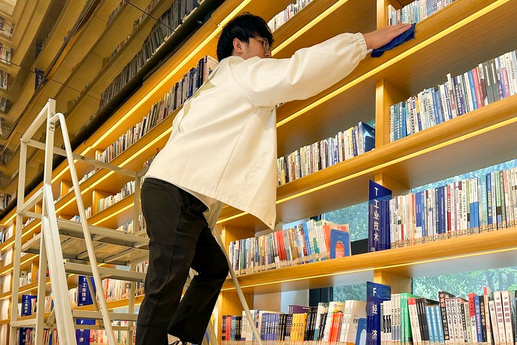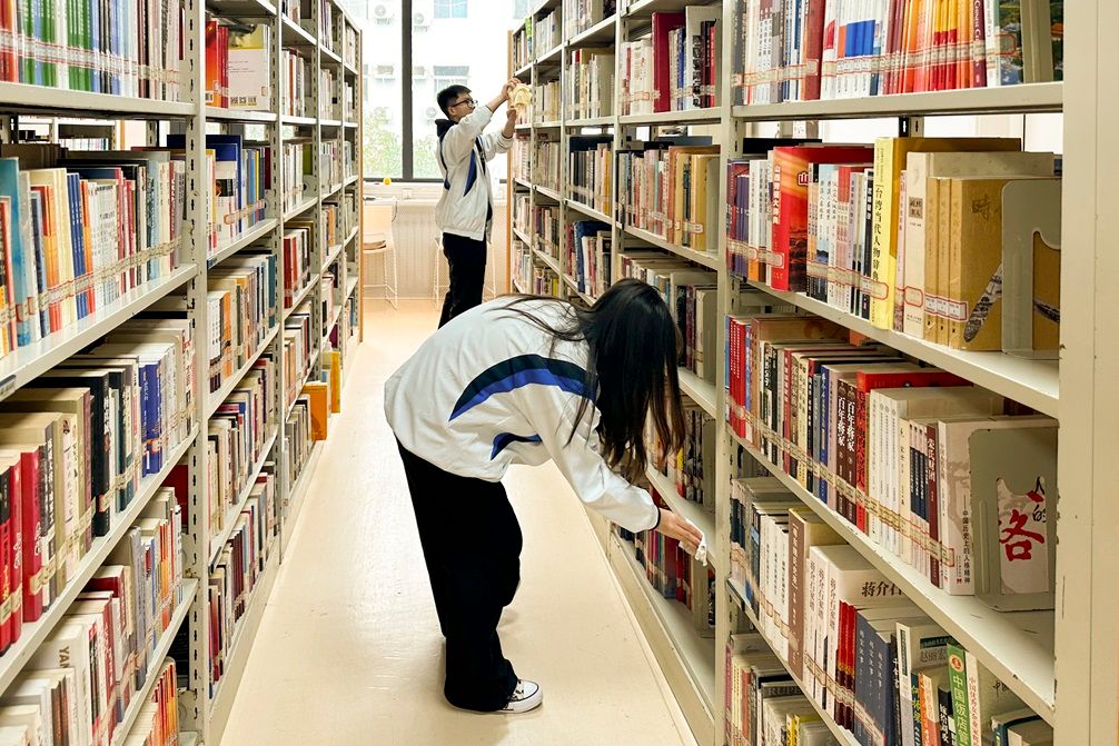 服务过程中,队伍成员默契配合、分工协作,严格按照工作标准推进任务。大家逐排梳理书架,将每一行书籍按书码整齐排列,同时仔细排查书架上的读者个人物品,取下后统一放置到各楼层回收占座推车上,待本楼层卫生打扫完毕,再将推车送至一楼服务台,由专人对接处理;书籍码放整齐后,成员们细致清理书本表面灰尘,随后用自带毛巾擦拭书架,不放过任何一处缝隙,确保书架无垃圾、无积尘;操作梯子整理高处书籍时,成员们互相提醒、全程留意安全,切实做到“工作有质量,安全不松懈”。小组长也充分发挥协调作用,合理分配本楼层成员工作,及时对接图书馆工作人员确认需求,保障各环节高效衔接。